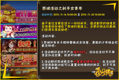 今天新版有活动:镖师唾手可得、双倍齐上阵 西域币提升50%、女性镖师唾手可得、抢龙门主演卡碎片、200%精英副本产出、200%劫镖产品,更多铜币、技能书、勾玉、稀有经验食物、稀有升阶材料、。。。。不好意思是不是太多了,是小编不好! 11月16日-20日:西域迎来“剁手女青年的逆袭” 活动期间关卡怪物华丽转变女侠客,西域币增长50%,所有女性镖师登陆西域商城献暧昧。这个活动绝对是男青年的福音啊,谁在双11没被剁过手?今日泄愤私艳开启。 11月17日-20日:委托版迎来“明星发镖任务” 这一次你再不用哭着喊着说抽不到主角卡了,因为今天《龙门镖局》的主演齐上阵发镖。在活动期间您的委托版将随机刷出明星委托镖单,完成镖单除了收获丰厚奖励外,更将受到随机宝箱奖励,有机会开出演员卡的碎片哦!! 11月17日-20日:PVP+PVE齐200%奖励 挑战是无处不在的,不论是与人斗还是与怪斗,但是这一次他们都要双倍。在活动期间凡是玩家去挑战精英副本或者劫镖都将收到200%的奖励回馈。此时不冲一下,还真对不起祖国啊~~