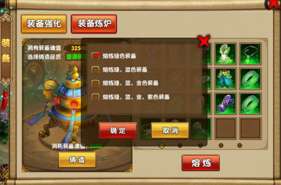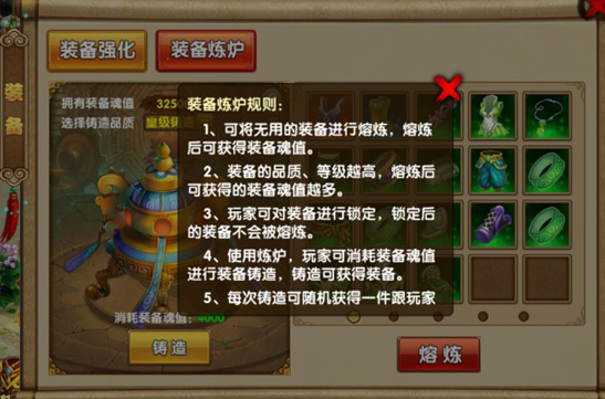 装备炼炉功能里面包含了铸造装备和熔炼装备。熔炼装备可以获得装备魂值,使用装备魂值可以进行铸造装备。