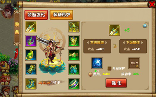 装备强化,即通过强化石及一定铜钱,通过强化进行等级提升。不同等级对属性有不同加成。等级越高,成功概率越低。玩家可以通过添加幸运符提高成功概率。1-5级需要低级强化石,6-10级消耗中级强化石,11-15级消耗高级强化石,需要数量依等级递增。 另外,等级+3、+5、+7、+10分别开启1、2、3、4个宝石槽,玩家可以根据需要镶嵌对应宝石。后续将会对应开放宝石系统。 下面小编给大家介绍下装备炼炉功能:
