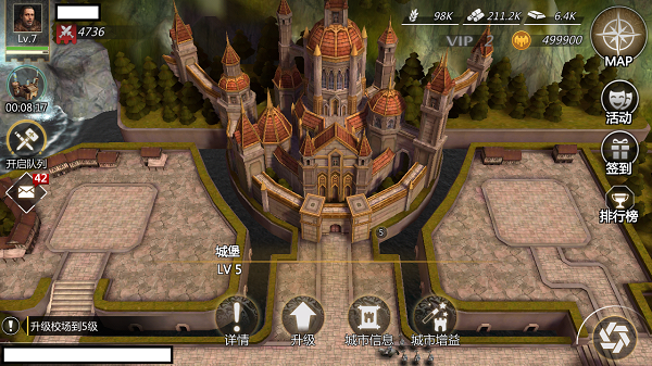 城堡全貌是不是很壮观优雅?中世纪风格的建筑简直就是小编的心头好呀~下图分别是城池信息和城市增益,不同的选择会有不同的效果,这样百般的聪慧策略,领主们,还不来一统天下?