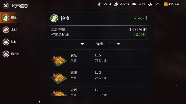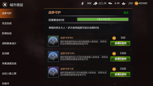 增益BUFF有哪些呢?战争守护,攻击加成,防御加成,反侦察,采集速度加成等。城池的方方面面都可以在城堡处得到完美提高。话不多说,应各位友友们的要求,直接上图!