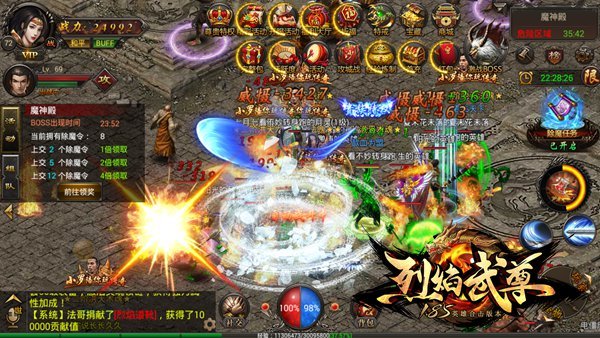 野外刷怪,多倍爆率,满屏掉落,神装易得。双倍离线经验,轻松等级直升,今天懵懂新手,明日沙城称雄!《烈焰武尊》开创全地图自由PK,即刻开战,看谁不爽,拿刀就干。极致微操,华丽狂秀,装备互爆,无惧红名!来与各路高手战个天昏地暗!