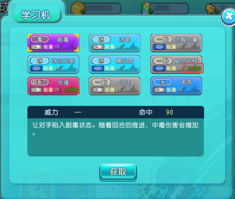 打开界面后可以看到精灵可以学习的技能,而技能上显示“已获取”,那就说明你已经拥有该学习机,可以学习该技能了。