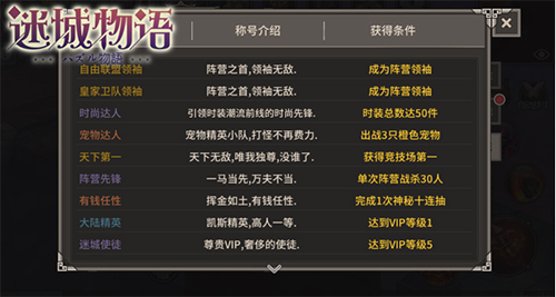 图3-宠物达人称号 【获得途径】 《迷城物语》中的称号大致分为VIP称谓、阵营称谓、成就称谓等,相应称谓的获取方法大家可以参考下图: