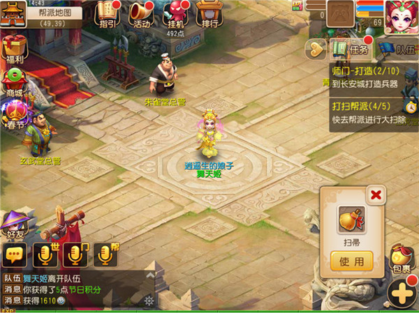 其他说明: 1、每天首次完成可以获得正常奖励,第二次完成可以获得侠义值,第三次及以上,不再获得奖励。 2、奖励不受双倍点数影响、不获得活跃度奖励。 3、可能获得金刚石、定魂珠、法宝精华、玫瑰花、金兰花等奖励。 【活动二:大扫除】 活动时间:活动期间全天可参与 活动要求:等级≥40级,单人 活动介绍: 在春节前扫尘,是我国人民素有的传统习惯。每逢春节来临,家家户户都要打扫环境,清洗各种器具,拆洗被褥窗帘,洒扫庭院,掸拂蛛网,疏浚明渠暗沟。到处洋溢着欢欢喜喜搞卫生、干干净净迎新春的气氛。大扫除的用意是要把一切“穷运”、“晦气” 统统扫出门。这一习俗寄托着人们破旧立新的愿望和辞旧迎新的祈求。 少侠也可以领取扫帚,在自己的庭院中进行大扫除,如果没有庭院,则可以在帮派、门派场景内进行大扫除。