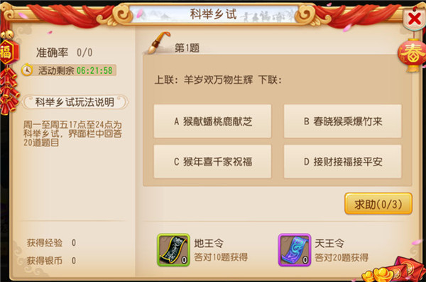 其他说明: 1、每天可以完成5次,没完成的次数第二日不保留。 2、奖励不受双倍点数影响、不获得活跃度奖励。 3、可能获得魔兽要诀、内丹等奖励。 【活动三:对春联】 活动时间:活动期间全天可参与 活动要求:等级≥30级,单人 活动介绍: 新春前夕,家家户户都会上街购买春联,有雅兴者则自己铺纸泼墨挥春。春联也叫门对、春贴、对联、对子、桃符等。它以工整、对偶、简洁、精巧的文字描绘时代背景,抒发美好愿望,是中国特有的文学形式。迎春活动期间,唐王也在科举题目中增加了对春联的环节,每天会有5道春联题目,答对春联题目后,可以获得额外的奖励,如果5到题目全答对,更有丰厚奖励。