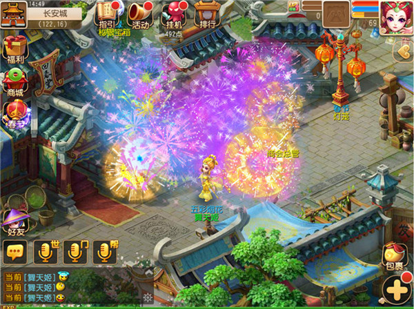 其他说明: 1、压岁钱存储上限为20万银币,请及时领取。 2、只有消费的银币会作为压岁钱存储起来,金币和仙玉不会计入统计。 【活动六:放烟花】 活动时间:1月28日00:00 至 2月11日23:59 活动要求:等级≥40级 单人 活动介绍: 放烟火是民间古老的节日民俗活动。以火药为基础发展起来的。起初,是专供贵族豪富争雄斗奢的消遣品,到了明、清,烟火制作技术有了新的发展,逐渐成为节日的礼品。每逢春节以及其它重大活动,都要施放烟火助兴。在新春期间,少侠可以在节日活动中获得烟花道具,或者直接从商会购买烟花道具,使用后可以在当前场景释放烟花。累计释放10、50、200、500次烟花后,还可以获得节日专属称谓。