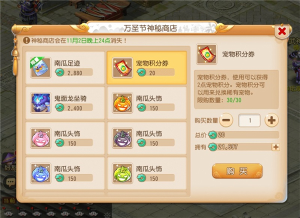 万圣商店:萌萌鬼面龙和你玩 随着万圣节的到来,万圣商店也如约而至。在今年开放的万圣商店中,玩家可以购买到包括南瓜灯家具、南瓜头饰、宠物积分券、南瓜足迹等各种万圣节主题相关道具。尤其值得一提的是,神秘的万圣节专属坐骑鬼面龙也将在万圣商店中出现,这一坐骑除了在节日商店中获取外,更可以通过摆摊从其他玩家处获取,喜爱这个萌萌坐骑的朋友,千万要留心商店开放时间,不要与鬼面龙失之交臂哦!