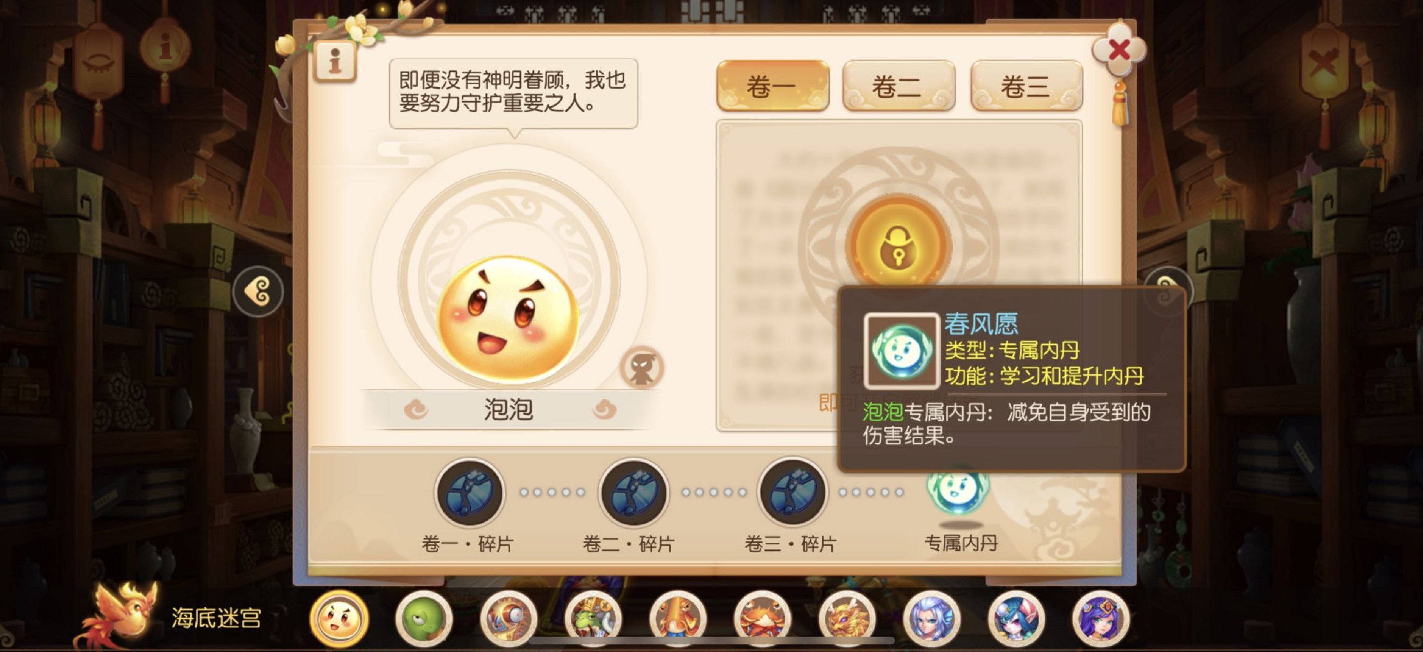 【春风愿】泡泡专属内丹:减免自身受到的伤害结果。