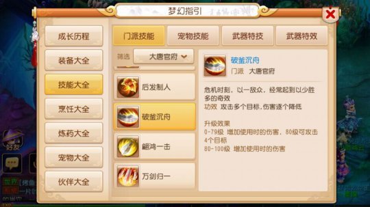 【破釜沉舟】 消耗64的魔法,攻击3个目标(80级攻击4个目标),伤害逐渐降低。 技能点评: 危险时刻,以一敌众!这个技能是大部分时候的挂机神技,作为大唐唯一的群秒技能,不用休息,效率比端游的破斧高了一倍!