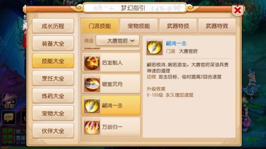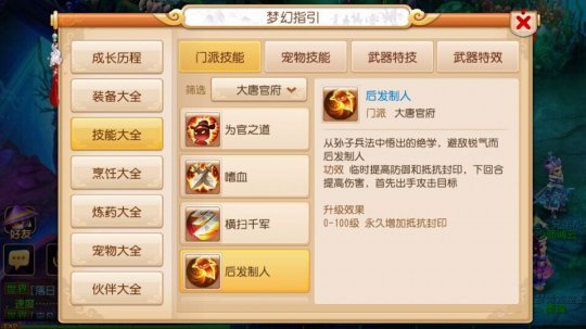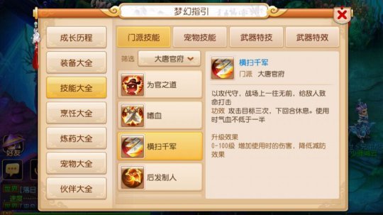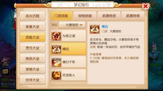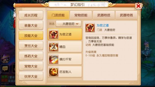 【为官之道】 大唐官府的基础技能,升级之后能永久增加物理伤害 技能点评: 对于纯物理输出的大唐,该技能可说是重中之重!被动效果增加物理伤害,物理系门派最喜欢的技能之一!