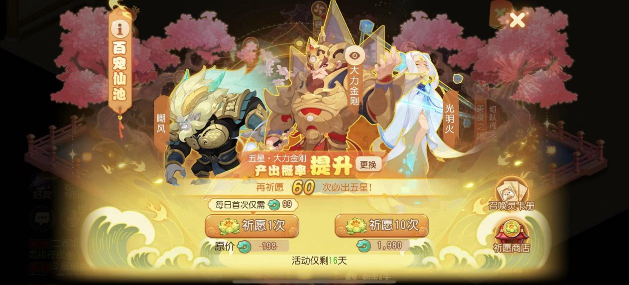 值得一提的是:百宠仙池是除摆摊购买外,获取大力金刚、启明星、龙龟等稀有召唤灵的唯一途经,且该玩法只在春节、端午、中秋期间开放。所以,喜爱这些召唤灵的玩家请务必抓住此次机会,获取自己心仪的召唤灵!