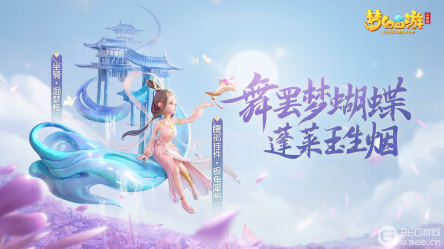舞罢梦蝴蝶,蓬莱玉生烟!要说三界什么与锦衣“白鹿凝霜”最为般配,非全新腰部挂件“银角犀照”与全新坐骑“洄梦枝”莫属。
