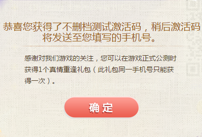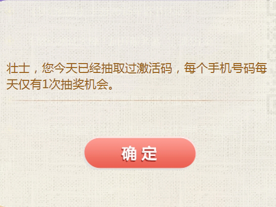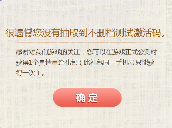 图2:成功抽取不删档测试资格 (2)每个手机号每天仅有一次抽取激活码的机会。如果今天没抽中,明天还可以用同一个手机号继续抽取。