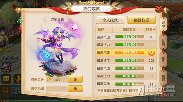 在全新的成就系统中,玩家不仅能够寻找到属于自己的辉煌瞬间,也会在其中发现不少趣味记录。与个人成就相辅相成的,是各个区内所有玩家的巅峰数据,《梦幻西游》手游将对各个区内所有玩家的气血、魔法、物理伤害、物理防御、法术伤害、法术防御、速度和治疗八大属性进行排名,将分为 0-69 、 70-89 、 90-109 以及全部四个分段。如果你渴望功成名就,就快来看看你的属性在区内的排名情况吧。
