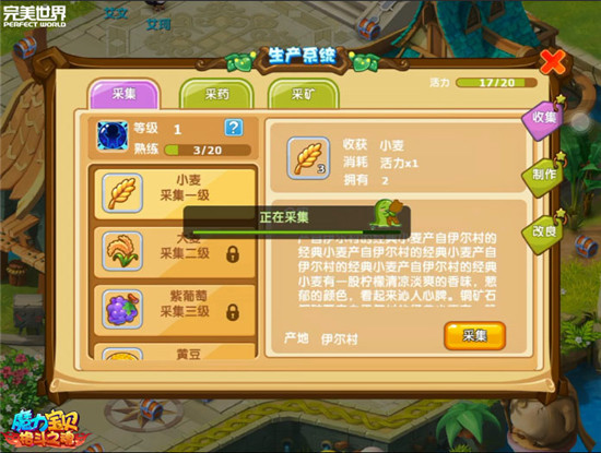 图6 【采集系统 开启闲趣新生活】 做日常刷副本挂机打怪,法兰居民的生活似乎每一天都在被这些因素围绕。全新资料片特别开启采集系统,让法兰的勇士们可以选择暂时放下刀枪,回归田园,享受一下闲趣雅致的全新生活。采集系统分为收集与制作两部分,收集系统分为采集、采药和挖矿,所得材料分别为食材、药材与矿石,而制作系统则是可以利用采集来的材料制成料理、合剂等,矿石则可做成强化零件。