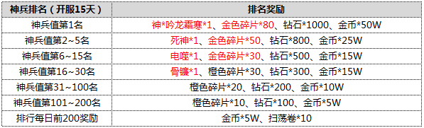 福利二、战力无双 巅峰之战拿金色武器 活动时间:2015年5月8日12:00~5月22日 活动区域:才高八斗 活动内容:活动期间内,神兵排行榜排名达到以下要求将会获得对应的奖励: