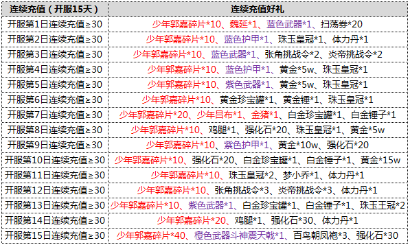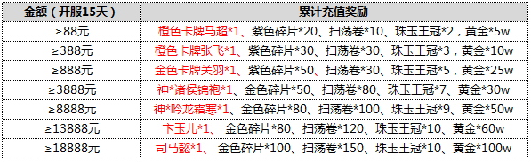 说明:连续7天充值可额外获得金猪一只,连续15天充值可额外获得橙色武器斗神震天戟一把! 福利六、累计充值 好礼不停 活动时间:2015年5月8日12:00~5月22日 活动区域:才高八斗 活动期间,累计充值到一定数额,金卡、金装、金色武器、司马懿、卞玉儿、后宫道具、关羽、张飞、马超、黄金等等疯狂送!