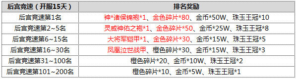 福利三、后宫竞速吊打妹子 活动时间:2015年5月8日12:00~5月22日 活动区域:才高八斗 活动内容:活动期间内,后宫竞速关卡数通关最高的玩家为第一名,若玩家在活动期间内都达到最高关卡,则按时间先后取第一个。活动结束后将会获得对应的奖励:
