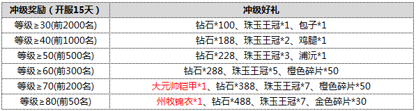 福利一、冲级竞速 好礼不断 活动时间:2015年5月8日12:00~5月22日 活动区域:才高八斗 活动内容:玩家等级达到30、40、50、60、70、80级都将获得官方准备的精美冲级好礼,包括橙色、紫色装备,碎片、钻石及后宫道具!