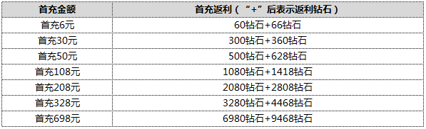 说明:该充值档次可累加,充值最高档可获得所有档次的奖励! 神*诸侯锦袍(金)目前为游戏中唯一金色防具,神*吟龙霜寒(金)目前为游戏中唯一金色武器! 福利七、首充钻石双倍返 活动时间:永久 活动区域:所有服务器 活动内容:充值面额除了月卡和周卡外,所有面额首次充值钻石双倍钻石返还。即: