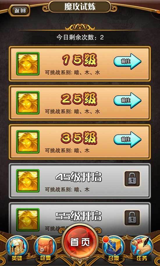 英雄试炼分为攻击试炼,恢复试炼,速度试炼,生命试炼,魔攻试炼,金币宝库和经验之泉,总共7个试炼之地,每个试炼之地分别有2次试炼机会。从周一至周日,每天都会有不同的试炼开启,大家记得去刷哦~