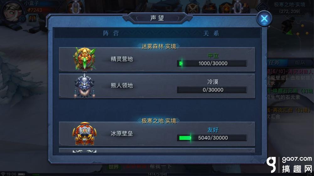 声望势力互克,专攻才是王道 声望任务在迷雾世界地图中是一个粉色的叹号,看到这样的标志,就可以走过去接声望任务了。每个章节的实境都有自己的声望阵营,比如在迷雾森林实境中就有精灵营地和熊人营地两个阵营;在极寒之地实境中有冰原壁垒、豺狼军团、巨魔营地三个阵营。
