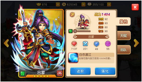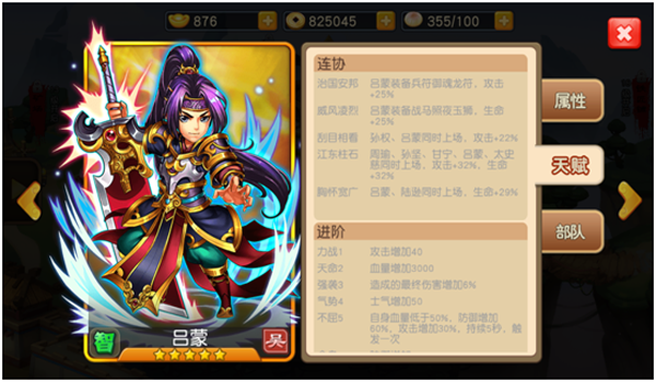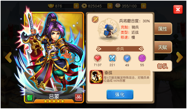 吕蒙带领的是克制骑兵的步兵,配合其自身和进阶的技能,能快速清缴敌方意图突进己方后排的骑兵,保护己方输出武将。 |