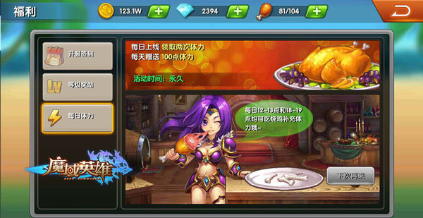 3.每日体力:体力不是很充裕的玩家可以每天的中午12点-13点以及下午的18点-19点登陆游戏,在“福利”界面领取《魔域英雄》每日特供烧鸡都可以再额外获得体力50点。这种吃大餐的活动一定不能错过。