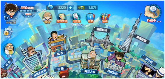 2、游戏界面 《名侦探柯南-纯黑的噩梦》整个界面相当主流简洁,左上角是个人信息,左边是隐藏的聊天窗口,上方是金币、钻石、公告、活动、签到和套装等,而背包、搭档、技能等主要按钮则隐藏在右下角的手表按钮里。各个游戏系统分布在整个主画面中,总体来说各项图标还是比较清晰的。 ![]()