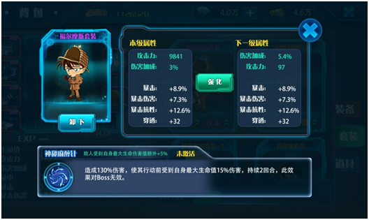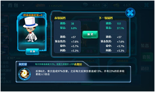 评分:★★★★☆ 2、时装系统 在《名侦探柯南-纯黑的噩梦》中另一个非常有趣的玩法就是时装系统了。目前总共6套时装可以供玩家穿戴。分别为: 增加暴击和速度的 怪盗基德套装 增加暴击和防御的 侦探团团服 增加攻击和防御的 背带裤套装 增加闪避和生命的 白色西服套装 增加防御和生命的 经典套装 增加攻击和伤害的 福尔摩斯套装 每件套装不光可以进行升级提供大额的属性加成,还可以对某些主动技能进行质变的强化。所有时装都可以在活动页面进行随机抽取,各地图的守关BOSS也会掉落强化材料。最让我惊喜的并不是时装的属性加成而是时装的人设,简直是不能再赞了!柯南穿上基德和福尔摩斯的时装简直可爱的不能自拔。 ![]() ![]()