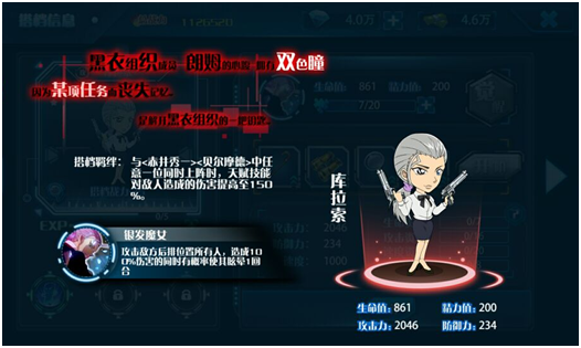 首先要介绍的就是剧场版中新加入的特殊角色——异色瞳库拉索。不光角色形象精细到两只眼睛不同颜色,就连人物介绍和牵绊缘关系都跟原著一模一样。实在是很佩服游戏制作者的用心。 ![]()