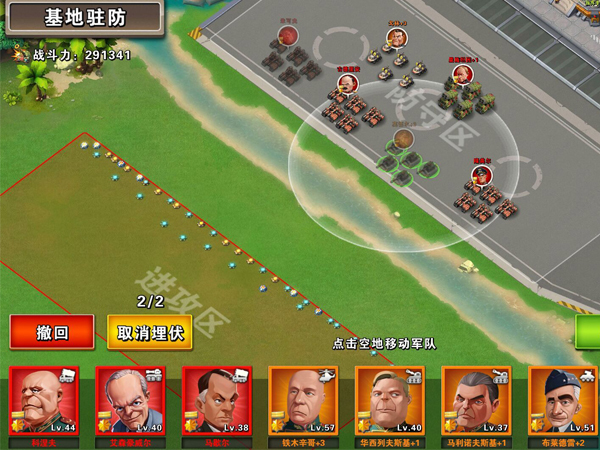 在每个玩家的军营前都有基地驻防区,玩家可以在最前线埋设地雷、在基地前布置兵力进行防御,以防他人对基地的侵略和掠夺。俗话说,最好的防守就是进攻,以英勇之师,强大战力,陆空兼备的军队负责防守,以不变应万变,不失为一个良策!首先,我们在进攻区设置反步兵地雷、反坦克地雷、高爆地雷等进行第一波防御,让侵略军未遇军队变死伤一半;然后,我们在防守区可设置军队进行阻击,为了防止敌人的陆空立体进攻,驻防部队需要有强力的肉盾、强大的输出、以及良好的防空部队,天启坦克、远程火炮、防空导弹绝对是“防守铁三角”,是当之无愧的经典配置!所谓“兵者,诡道也!”,设伏也会有出其不意的战略效果,驻防部队最多可以设置两个兵种进行埋伏,这样敌人侦查时是看不到的,但是当敌人的部队来到跟前的时候,埋伏的部队就会突然杀出,给敌人个搓手不急!先示敌以弱引敌进攻,再出动主力予以围歼,何不乐哉!