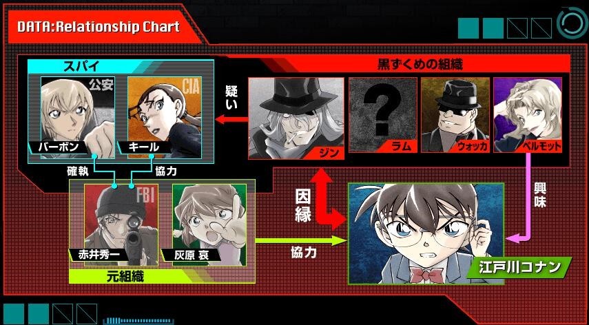 黑衣组织成员:琴酒(对间谍产生“怀疑”;与柯南为“过节”关系)、朗姆、伏特加、贝尔摩德(对柯南“有兴趣”)