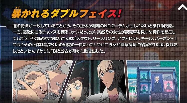 由于双瞳的特征相一致,灰原担心这位神秘女性的真实身份就是组织的NO.2=朗姆。另一方面,当柯南正在寻觅接近宿敌的机会时,神秘女性在看到观览车时竟突然发作了起来。发作时,她的嘴里嘟囔着:“司陶特(Stout)、威士莲(Riesling)、阿夸维特(Aquavit)、基尔(Kir)、波本(Bourbon)…” 果不其然,她的真实身份正是黑衣组织的一员!之后,在她被送到警察医院接受保护后,FBI和公安推测时机已经成熟,于是便开始悄悄地展开行动。