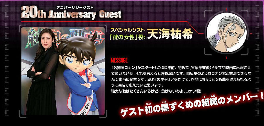 在“名侦探柯南”开播的20年前,正是天海女士首次(宝塚毕业后)出演电视剧和电影的时期。一念及此,感触颇深。能与同级 生一般的柯南君共同出演,我感到十分荣幸。我想以演技作为回答,赌上自己20年的演艺经验,力求能为作品增光添彩。