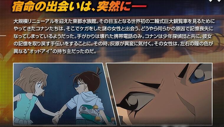东都水族馆迎来了大规模整修。柯南一行人为了参观馆标——世界首辆二轮式巨型摩天轮——来到了水族馆。在那里,他们遇见了一位受了伤的神秘女性。她似乎由于某种原因丧失了记忆。而线索只有一部坏了的手机。柯南决定与少年侦探团一起,帮助神秘女性找回记忆。就在那个时候,灰原察觉到了异常。那位女性竟是拥有一对瞳色相异的“异色瞳”。