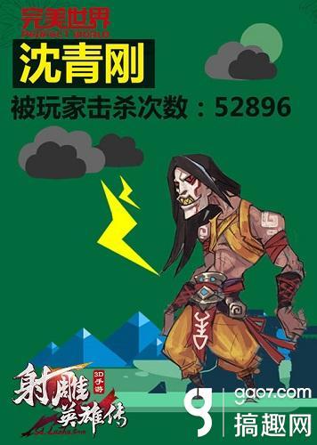 黄河四鬼老大,沈青刚,人送外号“断魂刀”。虽说这江湖称号看起来狂拽酷炫吊炸天,但依旧逃脱不了打酱油的命运,黄河四鬼作为《射雕英雄传》原著里配角中的配角,武功十分低微,出场即被秒杀。在游戏中,测试期间总计被玩家击杀52896次,平均每五分钟,就有一只沈青刚被打死,酱油从小说到游戏打了一路,依旧摆脱不了悲催的命运……但沈大叔表示,玩家虐我千百遍,我待玩家如初恋,虽然我死的多,但我长的丑啊~就凭这种大无畏的自嘲自黑精神,沈大叔,年度最强酱油王非你莫属!