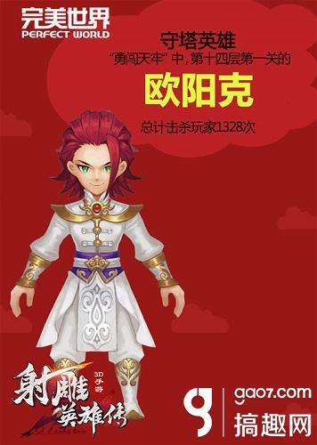 欧阳克,白驼山庄少庄主,西毒欧阳锋之子,人送外号“小毒物”。在《射雕英雄传3D》手游安卓首测中,各位射友对他的痛恨程度不亚于花哥(花迎春),作为勇闯天牢第十四层第一关的BOSS,如守塔狂魔一般的存在,测试期间总计击杀玩家1328次,不知断了多少射友的财路,果真是“虎父无犬子”。不过江湖上有句话叫“出来混迟早要还的”,长得再帅也没有用,待下次测试,看我大射友如何报仇雪恨!