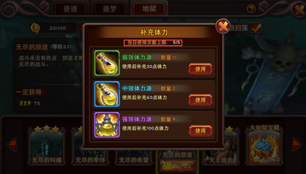 体力药水能让玩家们每天参加更多的副本,获得更多的经验和道具,因此玩家不用太过于节制,只要觉得需要,就可以尽情的使用。