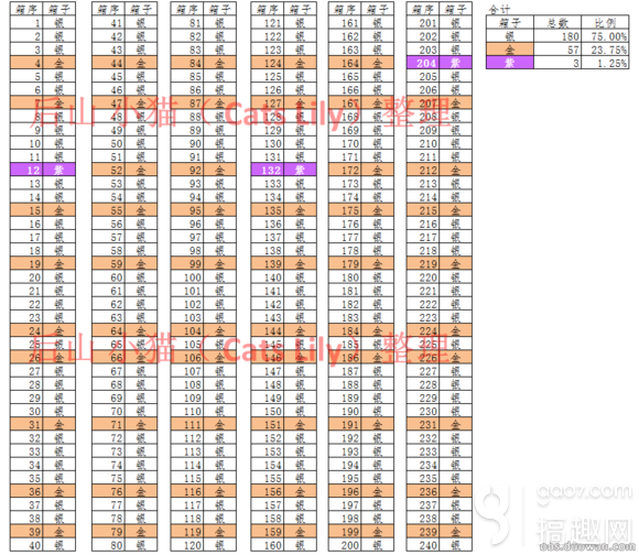 240个箱子为一个轮回,含180个银箱、57个金箱、3个紫箱。其实3个紫箱是在12、132、204三个位置取代了金箱,不考虑这三个紫箱的话也可以看成是40个箱子为一个轮回。