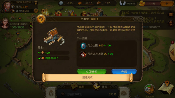 游戏中,按照任务的流程,弓兵营会在最后一个被建造出来,要想训练弓兵,需先建造弓兵营,弓兵营升级需城堡达到3级才可以建筑,升级弓兵营不但可以增加兵力的上限,对解锁更高级的步兵也起到了决定性作用。弓兵是远程单位,距离是他们天然的优势。但是弓兵的先天优势是不被任何兵种相克,是的,你没看错,就是不被任何一个兵种相克,而弓兵天然的射程优势又可以视为克制任何一个兵种,所以发展弓兵也是对部队的整体实力提升有一定的益处,但是弓兵的短板之处在于适合携带弓兵兵种的将军少的可怜,得到弓兵将军的赶紧视为珍宝吧。