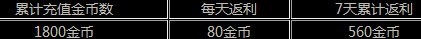 新服开启之日至下一个维护更新前止,累计充值1800金币的玩家,连续7天每天获得80金币的福利,累积获得560金币的返利。