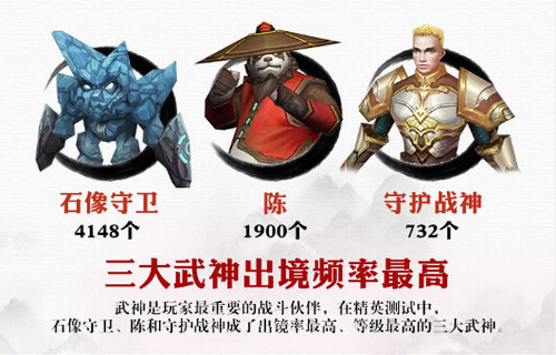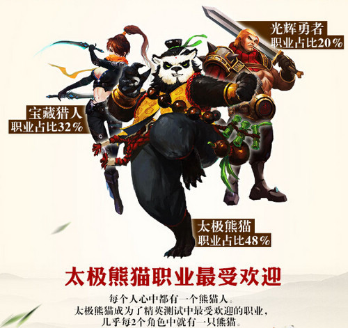 每个人心中都有一个熊猫人,太极熊猫成为精英测试中最受欢迎的职业,基本相当于宝藏猎人和光辉勇者加起来的总和,几乎每2个角色中就有一只熊猫,光辉勇者的人气则稍显不足;武神是玩家最重要的战斗伙伴,本次测试中石像守卫、陈和守护战神成为出镜率最高、等级最高的三大武神,虽然看来石像守卫虽然只是蓝色品质的武神,但其横扫全屏的激光技能还是非常受玩家欢迎的。