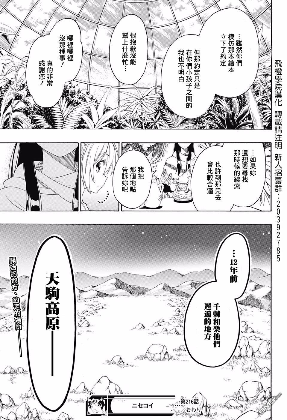 《伪恋》漫画刚连载时的设定就是一条乐小时候和一个女孩子一起看绘本并约定未来要成为恋人,一条乐有个锁而那女孩又把钥匙,那么多年过去了一条乐一直对当年的女孩念念不忘但又想不起来她叫什么长什么样子,一开始登场的小野寺、千棘似乎都是当年的那个女孩,后来伪恋的剧情里找当年女孩这主线剧情就不怎么踢了完全变成了一条乐的学园日常恋爱喜剧。不过在羽姐、万里花、诚士郎、小春相继出局后,伪恋又回到了起点的一男两女模式。在 216 话中千棘的老妈说明了自己和一条乐的老妈是高中的同学,而一条乐的老妈是当年那个绘本的作者,虽然 216 话中一条乐的老妈出场但是全称没有露脸,只是告诉千棘回到小时候和一条乐等人邂逅的地点天驹高原。 216 话里有小野寺对一条乐说「我会一直在你身边」这类的自灭性 Flag 台词,目前千棘已经有了男主跨国追妹+父母相识的光环,千棘股再次高高的涨停,小野寺翻盘机会渺茫。希望古味直志能在 217 话里解释一下为什么一条乐印象中当年只和一个女孩子要好,但是在妹子们的记忆中变成了小时后所有人都和一条乐关系良好。