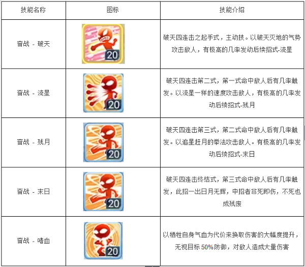 我们先开看看主输出的奋战系。一共5个技能,其中破天→流星→残月→末日,就是武师的经典四连招式,在实战中,只要发动技能破天,便有几率发动连击,把后续的流星、残月和末日三式全部打出,一旦4连成功,物防稍弱的角色即便没倒下,也血量见底了。但实战中水粉们能发动多少段的连击,就比较看玩家的运气了。