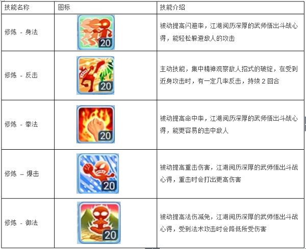 从修炼系的技能可以看到,技能被动提升人物的多个属性,包括闪避、命中、暴击伤害、法抗四项。属性的提升,对应了武师进阶的过程,当所有招式全学会之后,剩下的就是肉身的锻炼,通过强健的体魄和敏捷的身手更好地发挥所学的招式。就像我们平时看武侠小说一样,一个高手学习到一定程度后,就开始闭关修炼,破关之后,虽然招式不变,但却威力大增。