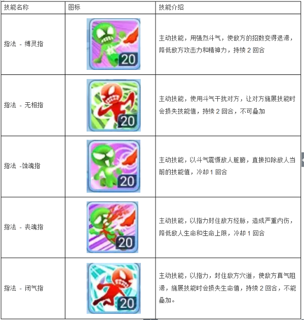 从设计上看,指法系是武师的一个另类玩法,从下表可以看到,指法系技能全是主动技能,意味着战斗中放弃奋战系的连击输出,改为通过指法削弱对方的攻击力、精神力、技能值、生命值和生命上限,限制对方的输出和加快对方的消耗,把战斗拖入消耗战。下测开启后,水粉们不妨一起测试下。