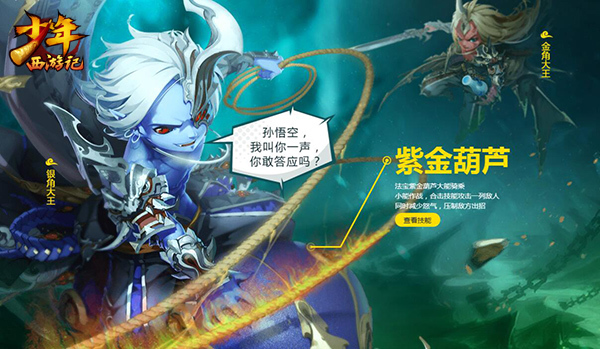 除了对宝物的真实刻画,《少年西游记》还独创了法宝合击的玩法,让上天入地的三界之战更为壮怀激烈。兄弟齐心,其利断金。当金角大王与银角大王同时身处战场时,他们将会联合发动“法宝 · 紫金葫芦”的最终奥义,对敌人造成毁灭性的打击。