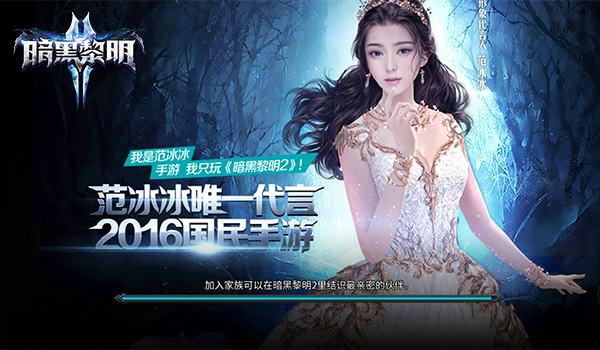 范冰冰2016唯一代言国民手游《暗黑黎明2》,“范冰冰”与“暗黑黎明”两大品牌强强联手,在游戏领域产生了唯一关联。《暗黑黎明2》倾力挑战目前ARPG手游产品的最高品质,五大群战玩法、主机级画质、实时跨服数据交互技术等,将再度为玩家开启国民级ARPG手游国度的大门!游戏以【跨服军团战】、【全服同地图阵营战】、【1000人公会战】、【魔兽级战场】、【团队遭遇战】五大PVP玩法为核心玩法,并辅以主机级画质、职业双天赋,实时语音、超强社交等辅助表现,带你进入手游战斗2.0时代!